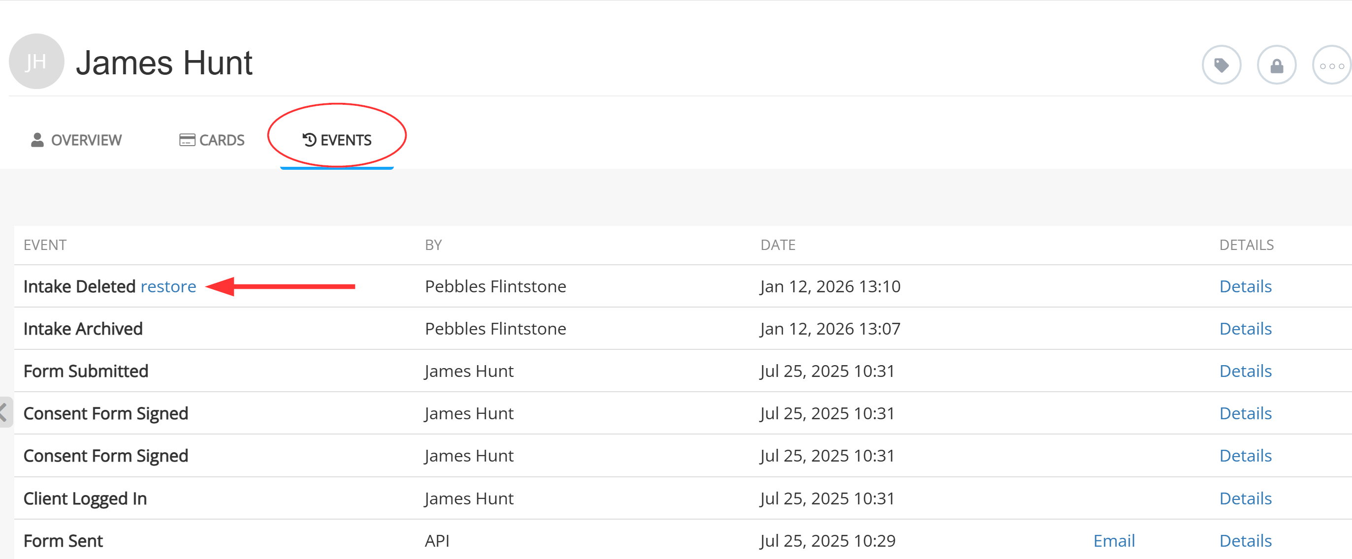 Select the Events tab to see a log of all events for this specific client. Here you can undelete a form if needed. If you are within the restore time window, you will see a restore text link next to the listing. Click the link to restore the form to the client's timeline.
