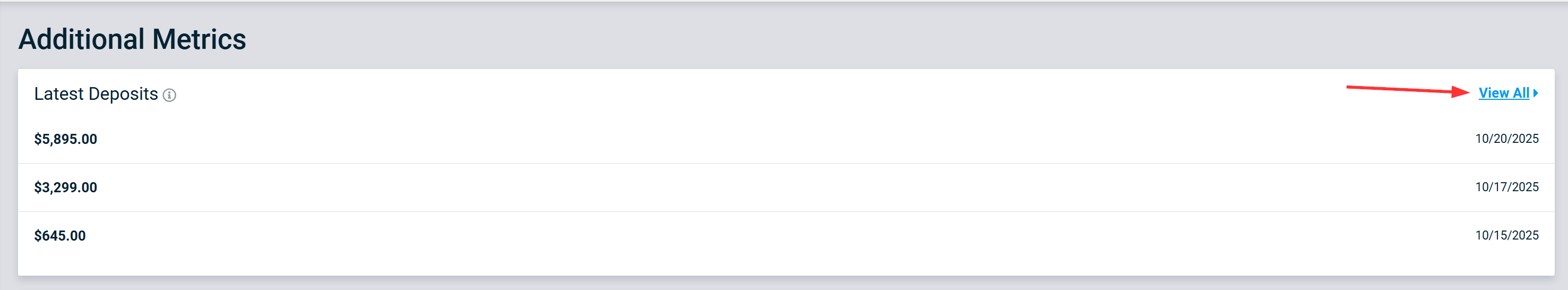 Scroll to additional metrics to view your deposits. View All lets you choose a date range, and displays date, batch, deposit and fees.