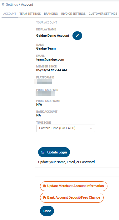 Here are the settings for your account: General Account, Team, Branding, Invoice, Customer and Notifications.