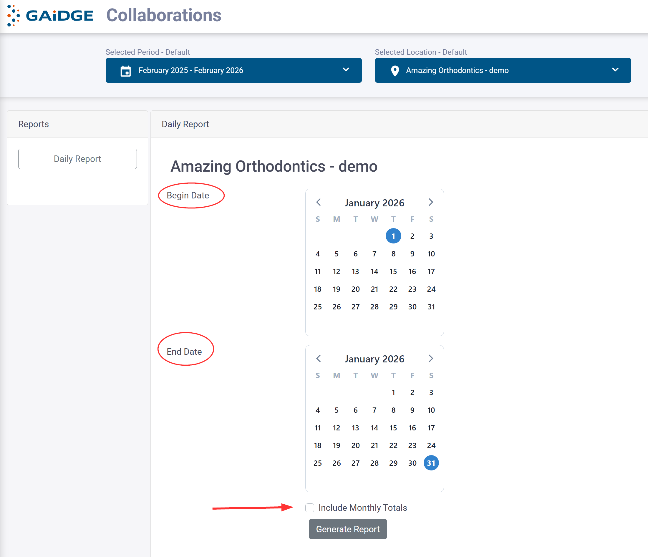 Select Begin Date and End Date. Next, if the date range is more than one month, select whether to Include Monthly Totals, and lastly click on Generate Report. Save generated spreadsheet.
