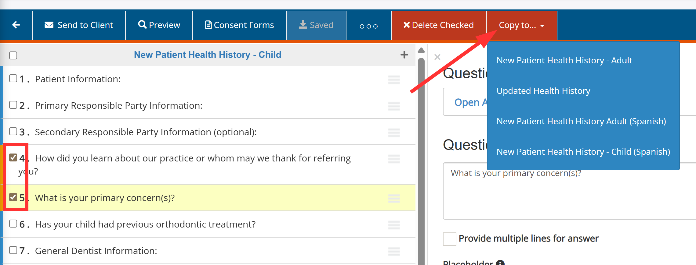 - Click on Copy to (the red menu item that appears) and select the form that you want to copy the questions to.