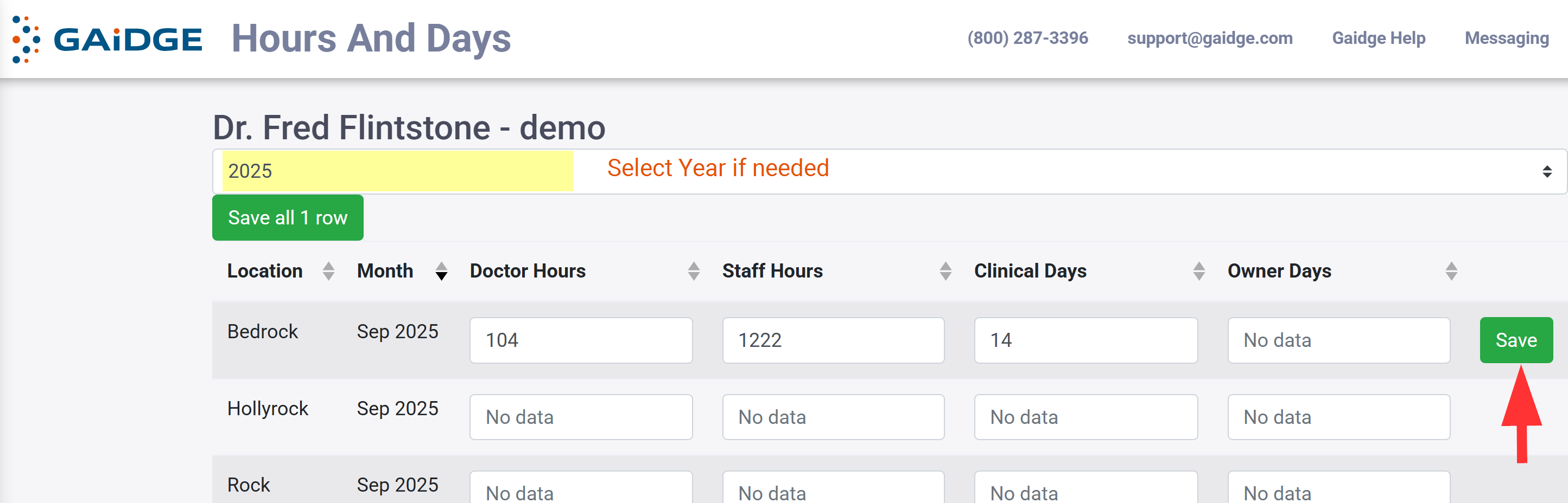 If you need to enter data for a prior year, click on the selection arrow on the year box. Enter the doctor hours, staff hours, and clinical days for the desired month, and then click on Save. (Owner Days does not currently report on Gaidge)